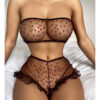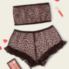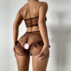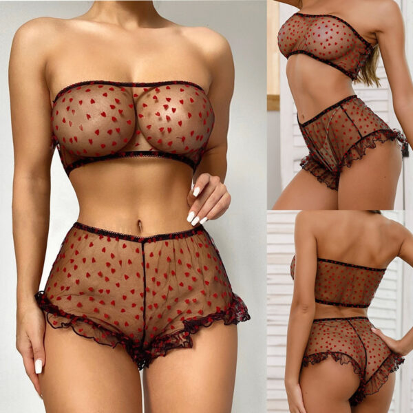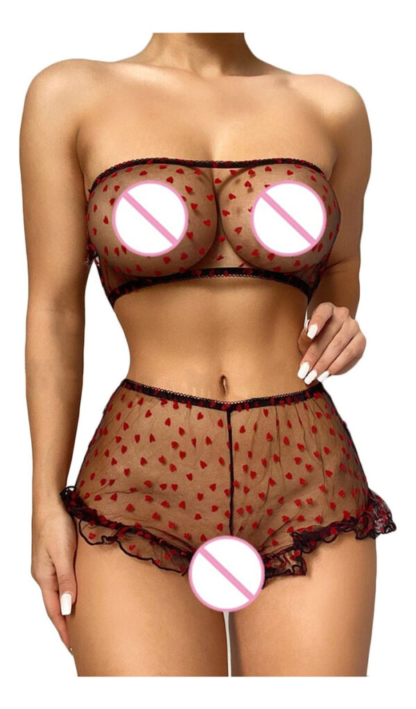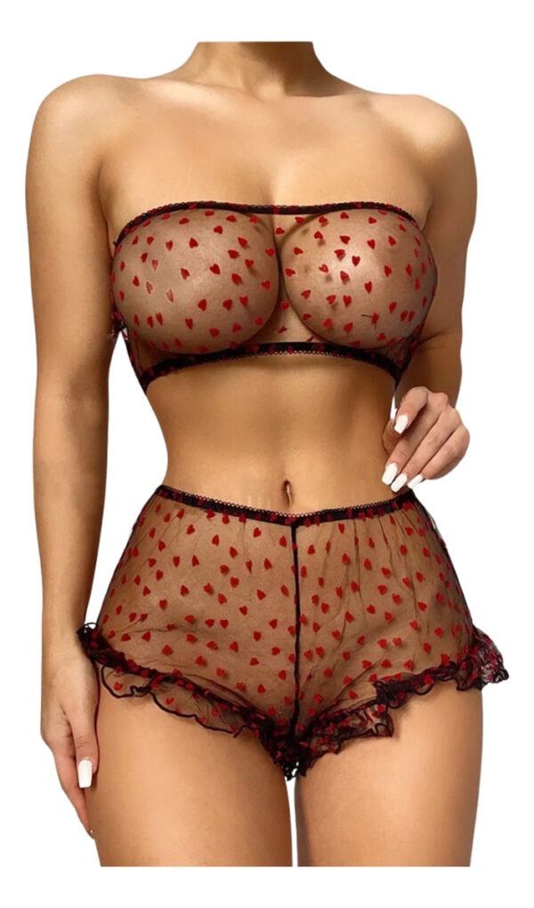 El bralette con detalles en corazones y volados añade un toque de sofisticación al diseño, mientras que el culotte less proporciona una silueta favorecedora, realzando las curvas de manera sutil y efectiva. Este modelo es una expresión de estilo, ideal para quienes buscan un lingerie que combine aspectos sensoriales y estéticos.