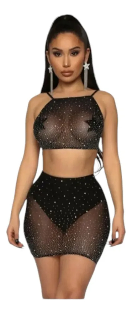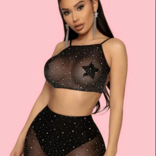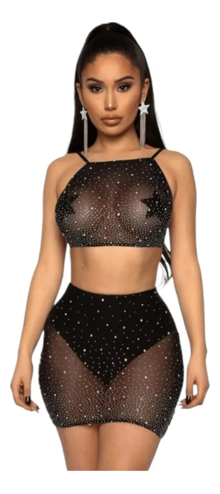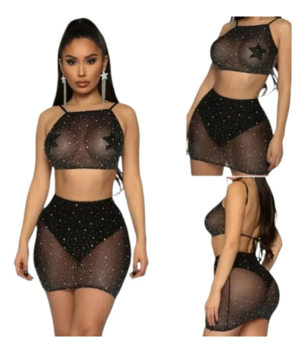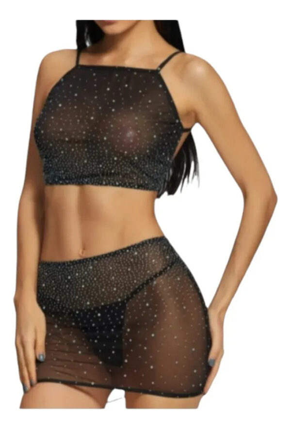 Confeccionado en tul con brillos, este modelo aporta un toque de elegancia y brillo que hará que te sientas única. La pollera y el culotte complementan perfectamente el bralette, ofreciendo una silueta atractiva y seductora, sin sacrificar la comodidad.
