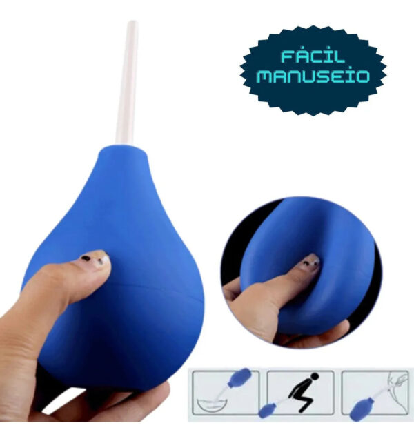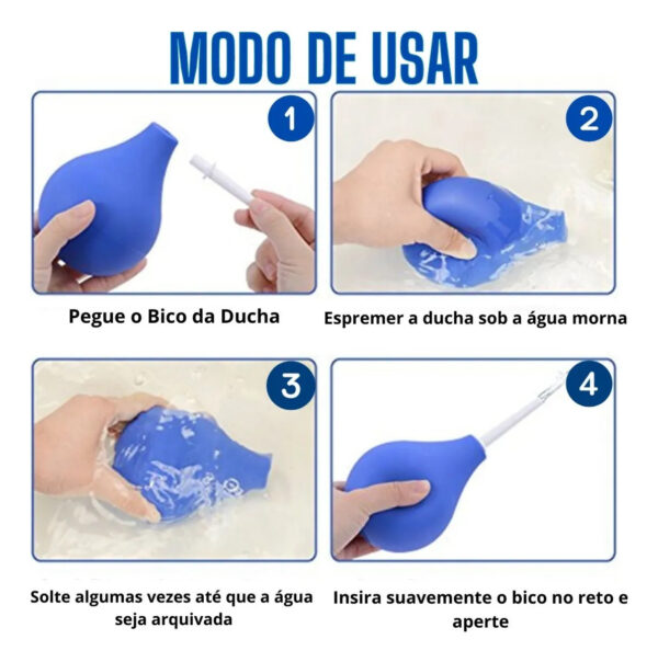 Llena el bulbo y cierra la boquilla. Para una limpieza óptima, dirige la boquilla (puedes usar lubricante de base acuosa si lo prefieres). Una vez insertado correctamente, presiona el bulbo para liberar un chorro de fluido. Limpia con agua y jabón antes y después de su uso. Deja secar completamente antes de guardarlo.