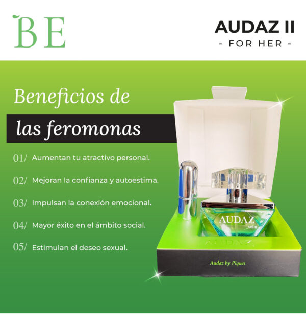 Úselo para impresionar en una cita, elevar su estado de ánimo o simplemente para disfrutar de una fragancia que acompaña su esencia única. Audaz Vol 2 es más que un perfume; es una declaración. AUDAZ VOL II con feromonas una fragancia sofisticada inspirada en la sensualidad de la mujer moderna.