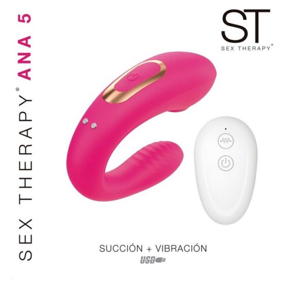 Sex Therapy Ana 5 Vibrador y succionador para parejas de ergonómico de doble estimulación, con dos motores tanto en clítoris como punto G con control remoto. Perfectamente cubierto con una suave y sedosa superficie de silicona. Es uno de los juguetes más vendidos para utilizar en pareja y poder divertirse ambos con su uso. Su cómodo diseño permite la penetración perfectamente para estimulación de ambos y llegar al goce pleno. Es el juguete perfecto cuando se desee placer instantáneo. Se inserta fácilmente y una vez puesto, se mantiene mientras juegas para una excitante sesión.